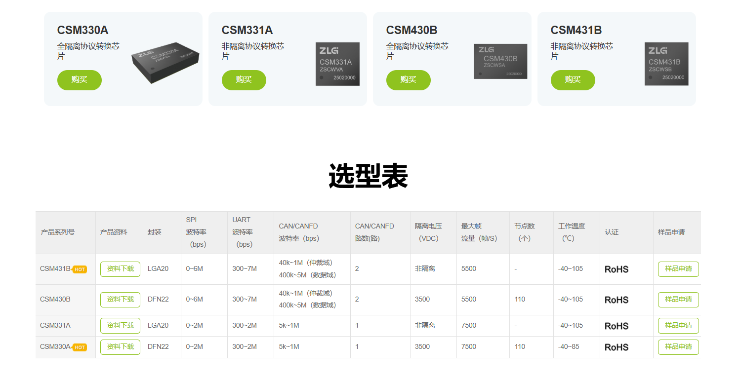 致远电子基于二十余年的总线隔离技术及工艺经验积累,推出SPI/UART转单路CAN芯片CSM330A(隔离)与CSM331A(非隔离)及SPI/UART转双路CANFD芯片CSM430B(隔离)与CSM431B(非隔离)。